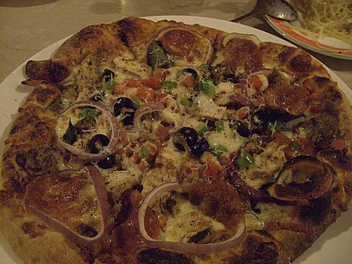 這是什錦(或是總匯)披薩390元,披薩餅皮不像必勝客那麼厚,但是很Q,很有咬勁上來的時候已經先切片好了。
