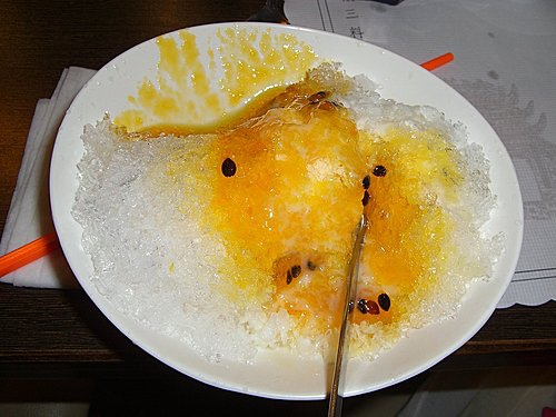 刨冰有百香果、烏梅、草莓三種口味選擇